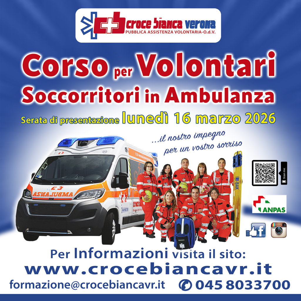 Il nuovo corso per aspiranti soccorritori in ambulanza di Croce Bianca Verona verrà presentato presso la nuova sede di Croce Bianca Verona in Via XXIV Giugno 32 – Verona (San Massimo).